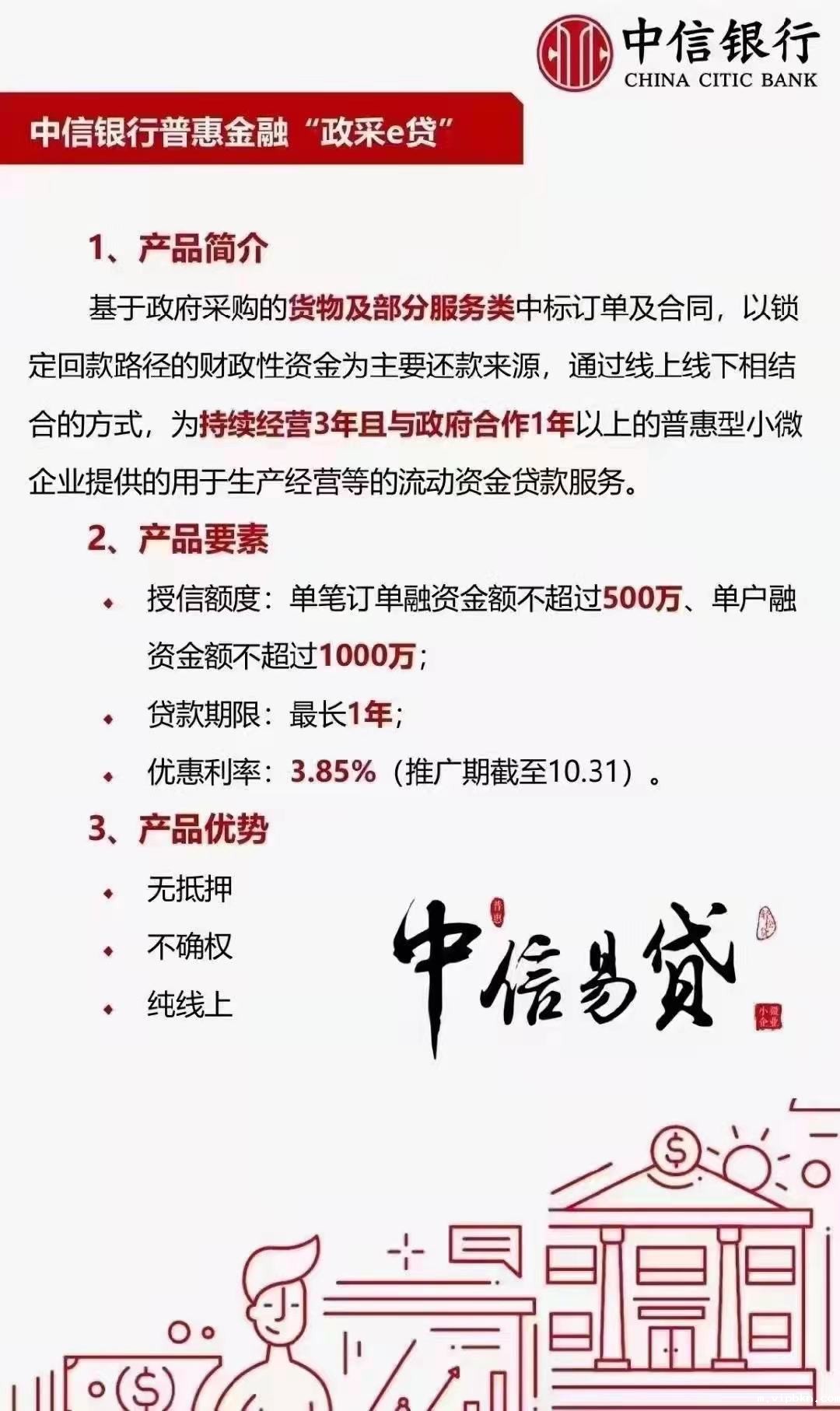 中信银行“政采e贷”具有额度高、门槛低、全线上、手续简、还款活五大特点:以政府采购合同总额的90%核定授信额度,单户贷款最高可达1000万元;中标即可贷,无需提供抵质押物;自动申请、审批、用款、还款,实现全流程线上化服务;提供简单的必要材料,即可获得授信额度,凭中标合同,随时申请使用;还款与政府采购合同回款进度相匹配,无后顾之忧。