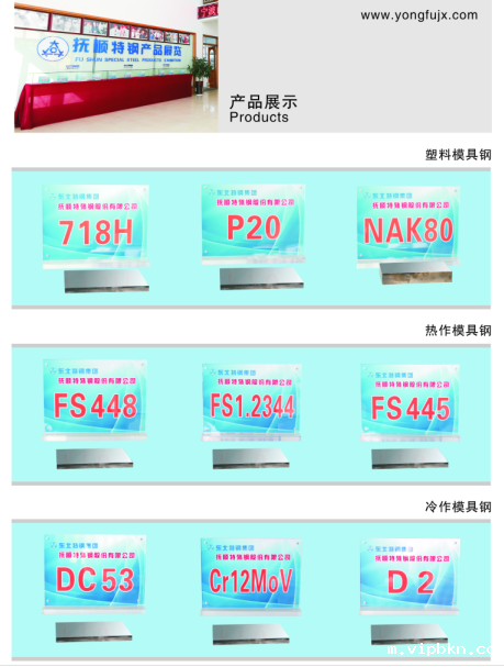 抚顺特钢以生产经营高档次、高附加值特殊钢为主要业务,是国内特殊钢行业的龙头企业。我司是抚顺特殊钢股份有限公司专营代理商,主要经营抚顺特钢的塑料模具钢(718H、P20、NAK80) 、热作模具钢(FS448、FS413、FS445) 、冷作模具钢(DC53、Cr12MoV、D2)的批发兼零售;同时,我司拥有一支技术实力雄厚的队伍为客户提供优质的模具热处理服务,并获得抚顺特钢认证。