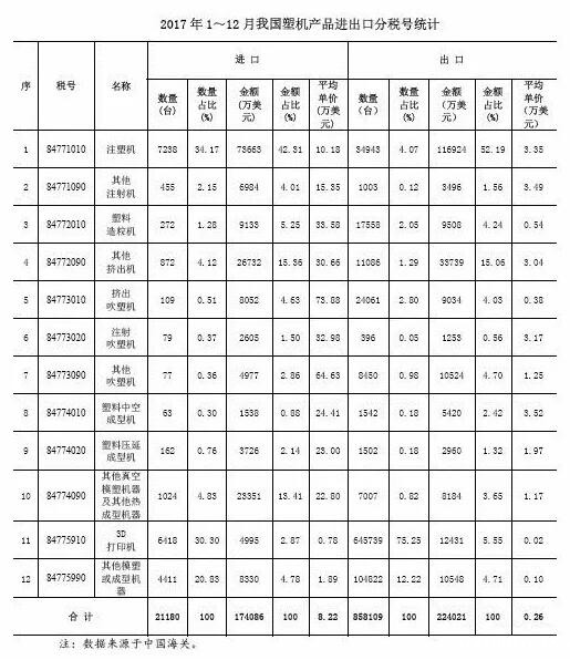 2017年,中国进口塑料机械21180台,进口金额约17.41亿美元,进口数量同比下降25%,进口金额同比增长30%。进口平均单价由去年同期的5万美元/台增长至8万美元/台。