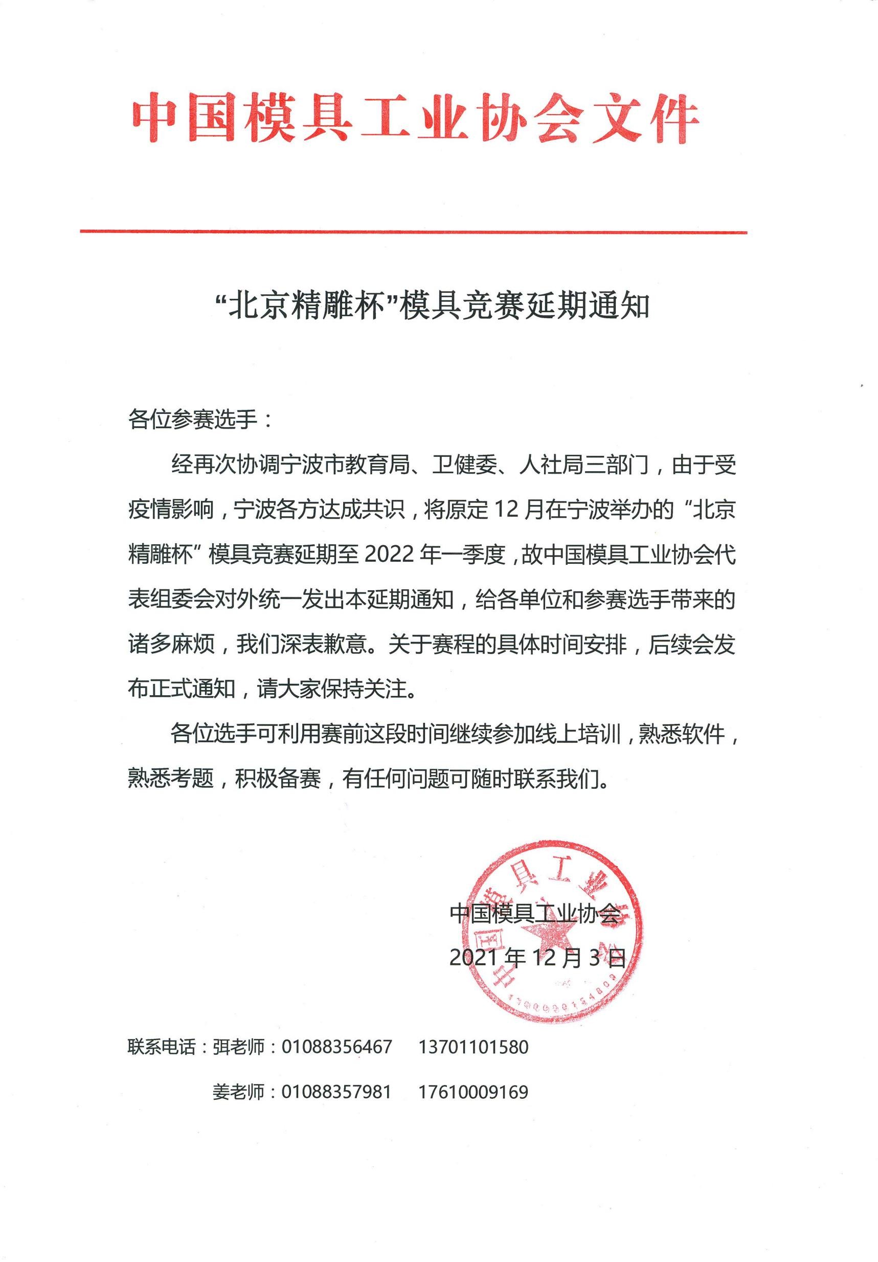 “北京精雕杯”模具竞赛延期通知